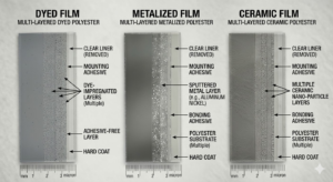 Dyed window tint is the most common and affordable option available. Manufacturers add a layer of dye between an adhesive layer and a protective top coating. This film absorbs solar heat and gives your car that classic dark appearance.